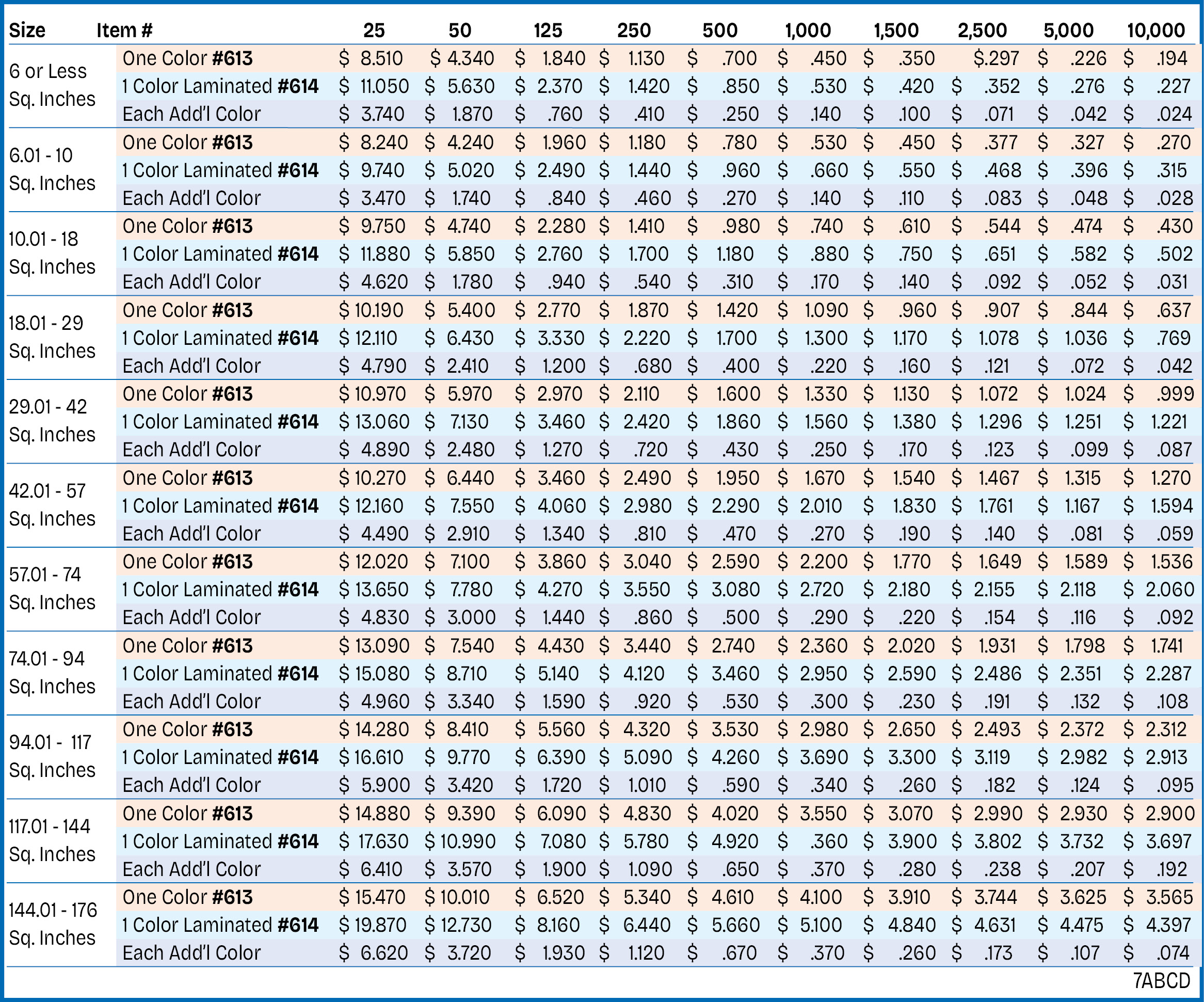 - COPY & COLOR CHANGES: $37.50 (E) for each color or copy change on decals up to 143 square inches. All sizes must be the same and all copies must be received at the same time. Each copy or color change must be in multiples of the minimum quantity shown for the selected size. Minimum of 100 decals per ink color. Combining printing color & copy changes on the same order is not allowed.
