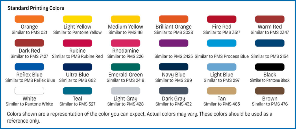 - COLOR MATCH: $36.00 (E) per each printing color match. We cannot guarantee perfect color matches. There is no additional charge for standard ink colors (see chart below).