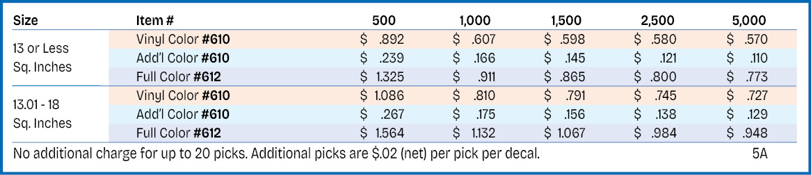 - PRINTING COLOR CHANGE: $27.00 (net) for each printed color change. Minimum of 100 decals per ink color. Combining printing color and vinyl color changes on the same order is not allowed.